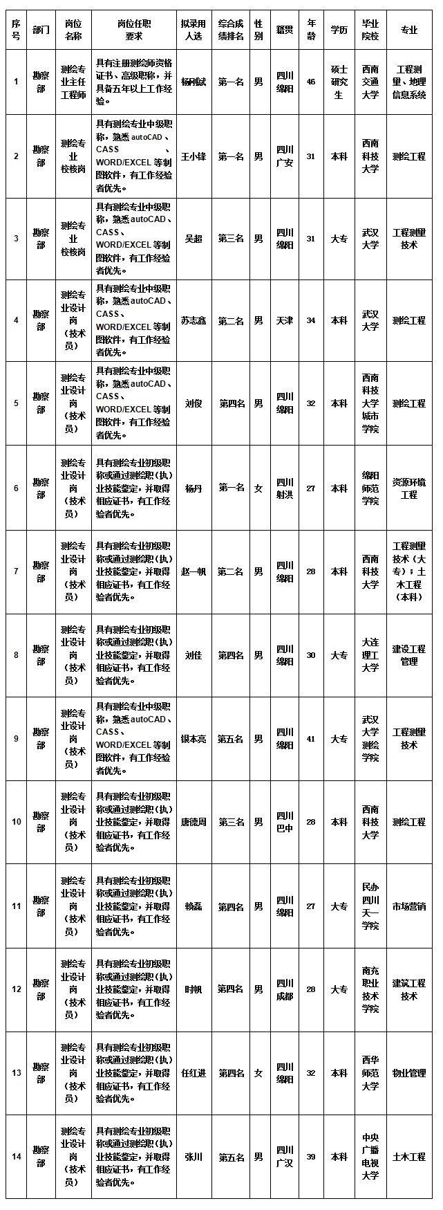 公司擬錄用測繪專業(yè)技術(shù)人員公示
