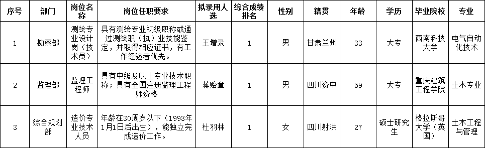 根據(jù)綿陽市水利規(guī)劃設(shè)計研究院有限公司(以下簡稱水規(guī)院公司)發(fā)布的2023年第12、13、14期招聘公告及招聘相關(guān)規(guī)定,經(jīng)簡歷初篩、面試、體檢等程序,王增錄、蔣貽章、杜羽鈴同志已符合公司錄用條件,現(xiàn)予以公示。