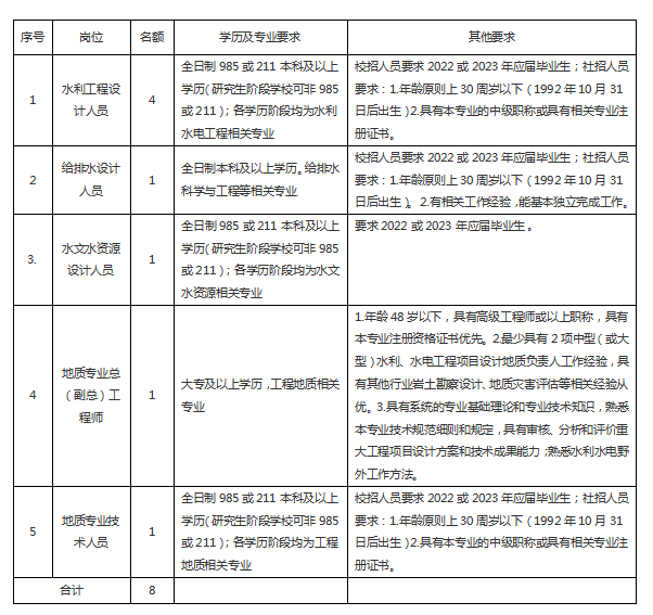 根據(jù)公司發(fā)展需要,現(xiàn)招聘水利水電工程、給排水、水文水資源、地質(zhì)等專業(yè)技術(shù)人員,詳情如下: